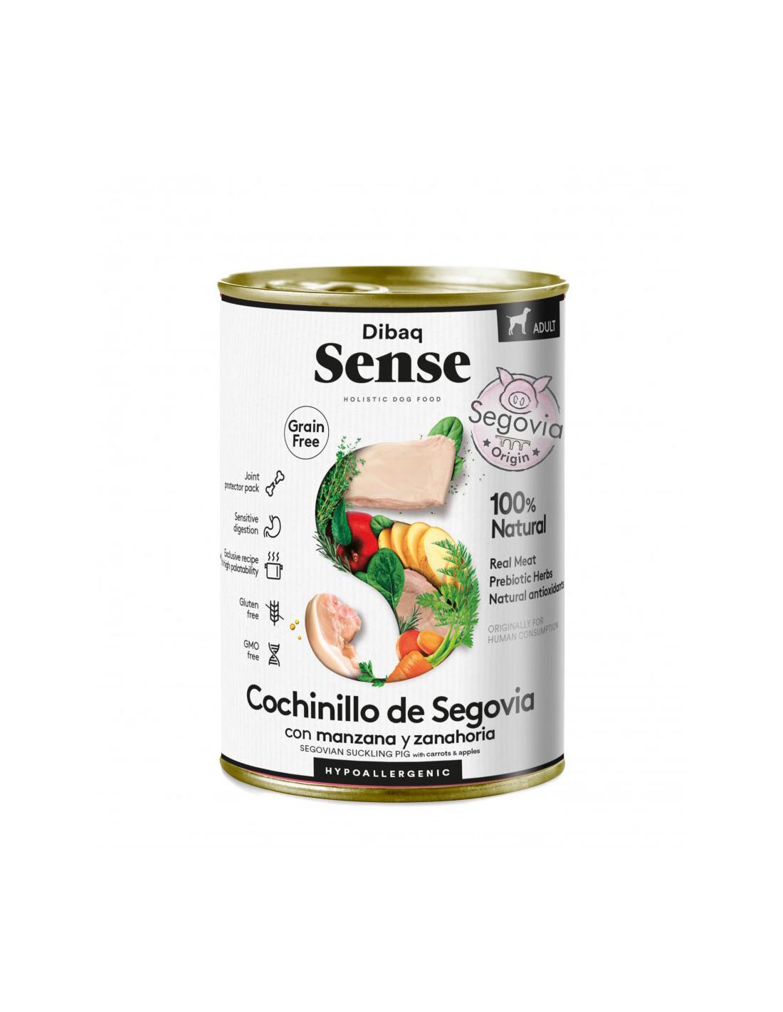 Dibaq Sense Lata Cochinillo de Segovia Deliciosa receta húmeda natural y completa para perros de todos los tamaños. Basada en, nada menos. un ¡76% de cochinillo de Segovia fresco!, acompañado de manzana, zanahoria, aceite de salmón, hierbas aromáticas (romero, tomillo y orégano) y un "pack protector articular" con MSM, Condroitina y Glucosamina (condroprotectores) Esta fantástica selección de ingredientes aportan a esta receta un sabor sublime e incomparable, gracias a la armoniosa combinación de todos sus ingredientes.